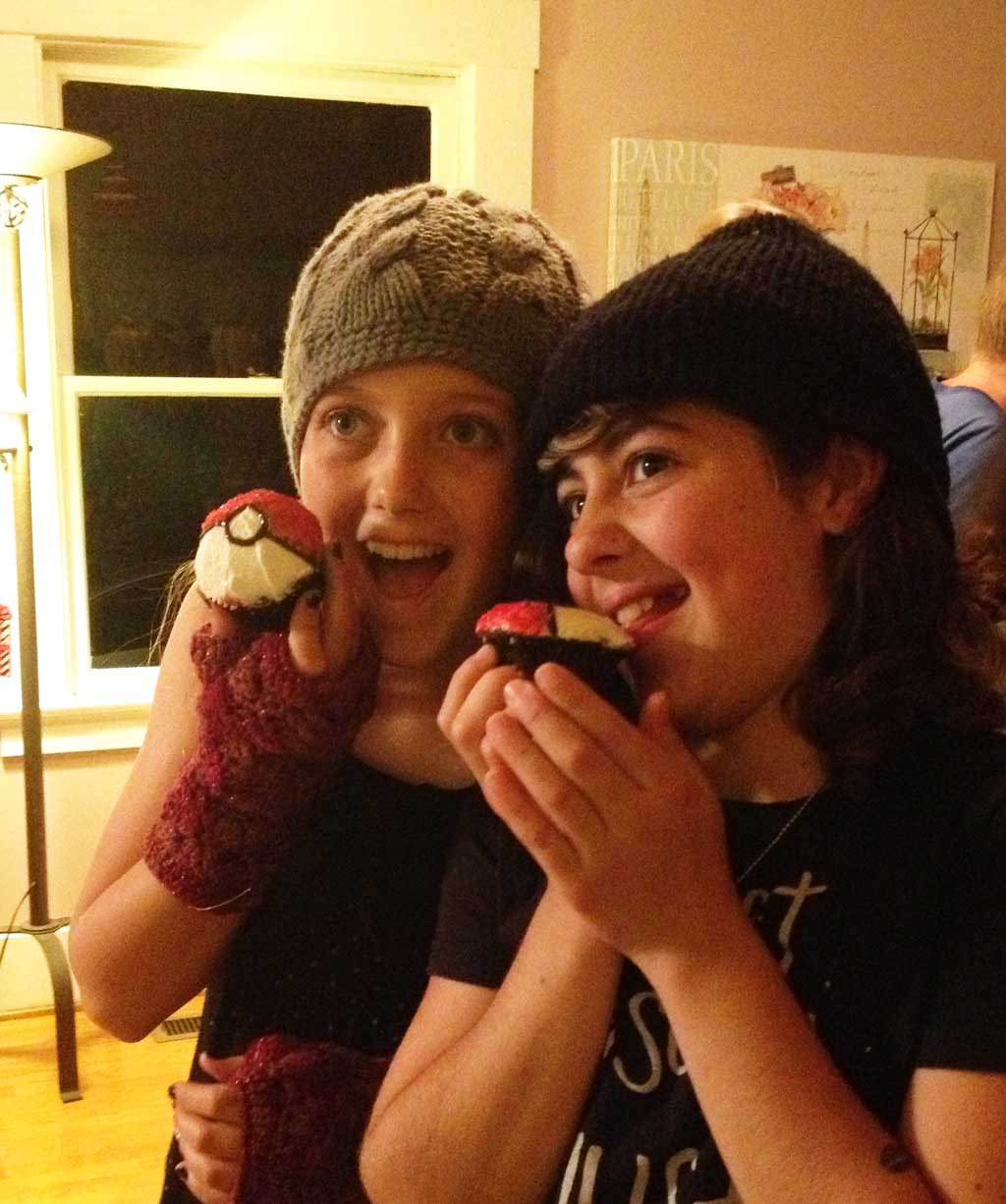 Pokemon seems to be a phase that everyone goes through at some point in their life (except for me because I think it may have been born when I was into punk rock music and thought I was too tough to like cute little kid stuff). Zen and Isabelle went through a pokemon stage a few years ago, and like most stages it faded away, and the Phamphey and Piplup jackets I made them went unworn. Then all of a sudden, after I had basically forgotten what the word pokemon meant, they came back to life–like little cute supernatural zombie creatures! Now all I hear about is charmander and houdour and celebi. So, it wasn’t a huge surprise when I asked what kind of cupcakes Isabelle and Ashleigh wanted for their 12th birthday dance party, and they said the theme was pokemon.